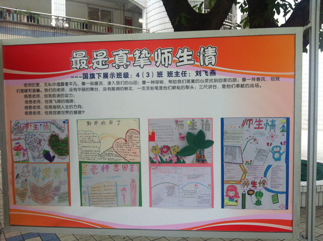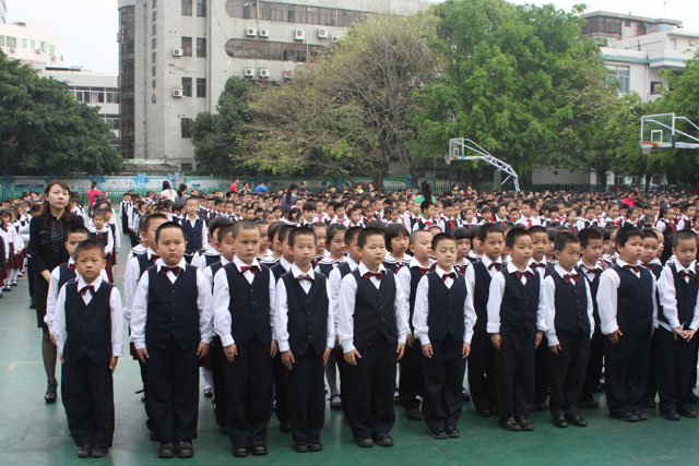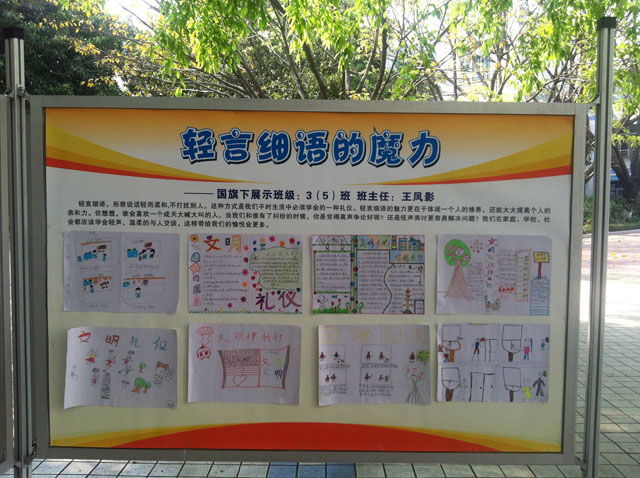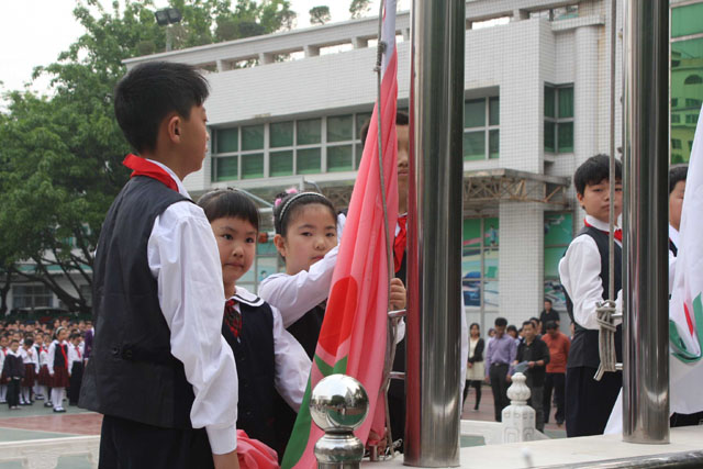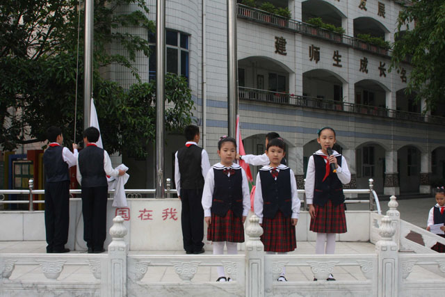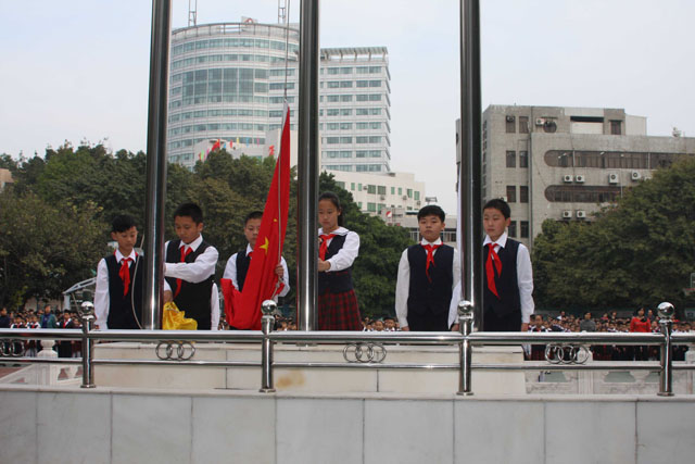 名优秀少先队员组成的升旗礼仪队,在每一周的升旗仪式上都有一套正规的升旗仪式程序,在每一周的升旗仪式上升起先进班级的班旗,由该班级承担国旗下的讲话和展示活动。